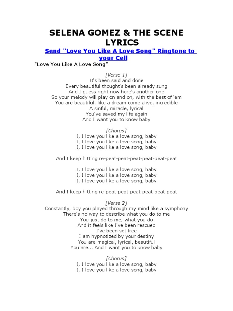 Love you like a love song baby selena gomez lyrics. 50 videos play all mix selena gomez love you like a lovesong ringtone youtube ariana grande one last time ringtone duration. It s been said and done every beautiful thought s been already sung and i guess right now here s another one so your melody will play on and on with the best of em. This ringtone was uploaded by paradise princess to music ringtones.