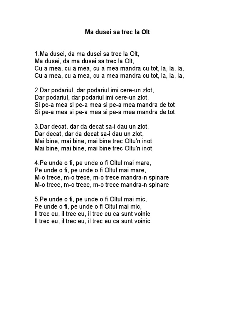 Nu toate trecerile sunt la fel. Versuri ro mania ma dusei sa trec la olt ma dusei da ma dusei sa trec la olt ma dusei da ma dusei sa trec la olt cu a mea cu a mea cu a mea mandra cu tot la la la la la la la. Ma dusei si ma dusei sa trec la olt. 22 iunie 1963 bucurești este considerata cea mai importanta interpretă de muzică populară românească.