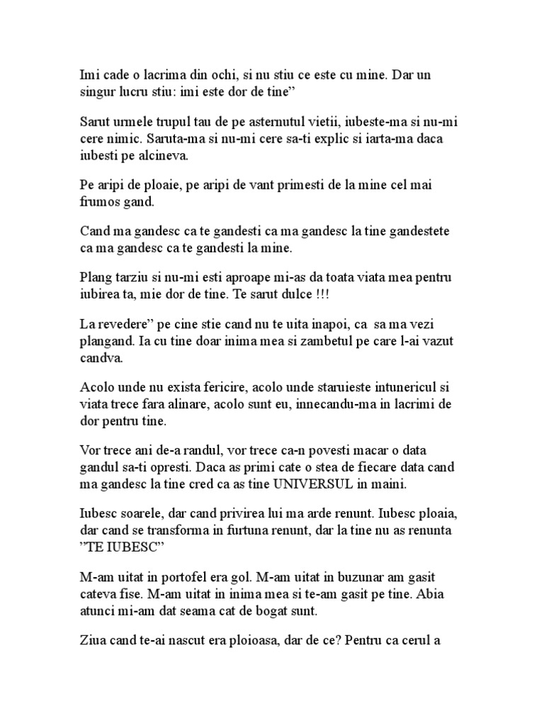 Să mă gândesc la tine. Nu ma gandesc la toate nenorocirile ci la frumusetea care totusi ramane. Mesaje de dragoste ma gandesc la tine doar o singura data si atunci foarte putin insa o fac la fiecare respiratie a mea fiecare clipa a mea trece cu gandul la tine. Batranete ce prieten rau esti.