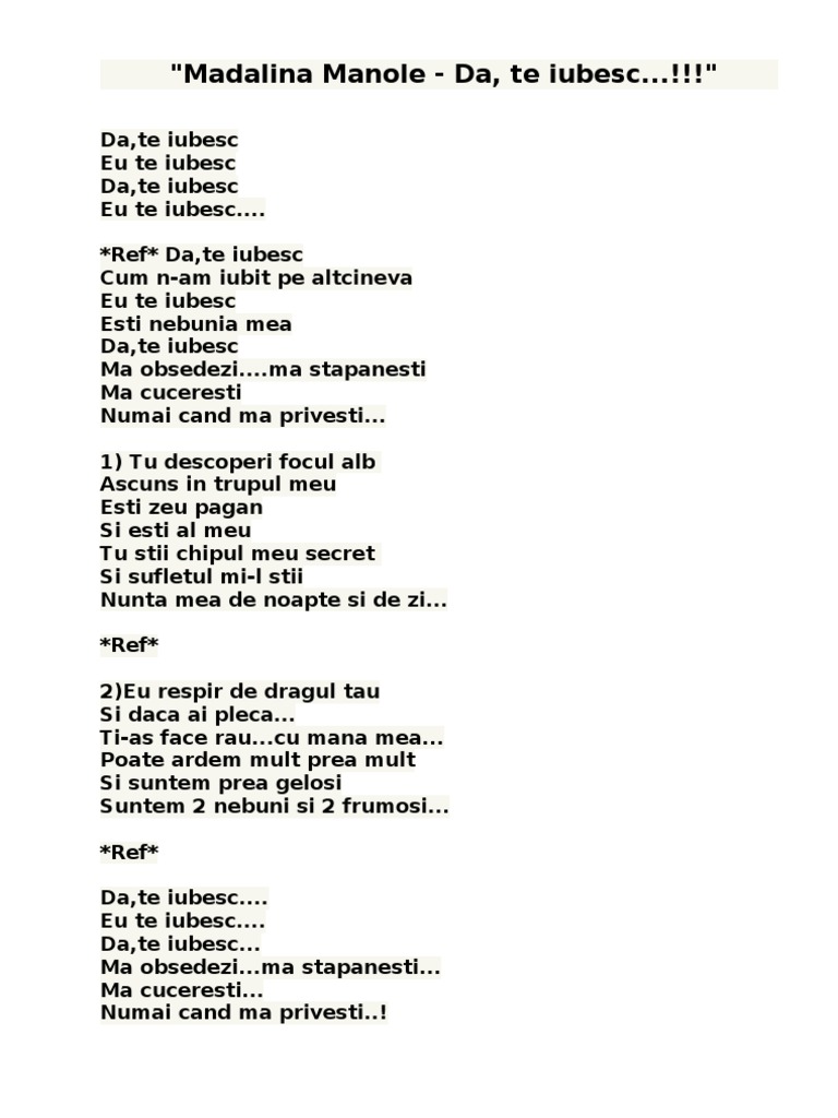 In anul 2000 dupa o pauza de doi ani de la albumul lansat precedent madalina manole a revenit cu dulce de tot material discografic pe care se regaseste si piesa da te iubesc piesa este considerata una dintre cele mai frumoase melodii ale madalinei manole. Mădălina manole callatis 2000 da te iubesc cum n am iubit pe altcineva. Lyrics for da te iubesc by mădălina manole. Da te iubesc eu te iubesc da te iubesc eu te iubesc.